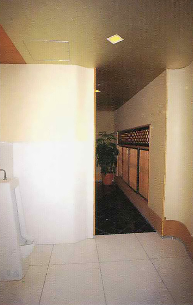 改築された雅叙園の1階ラウンジに位置する太鼓橋のあるメイントイレは、その3か所のトイレの特徴あるディテールを取り入れてあります。つまりこのトイレに入ると、旧雅叙園の数か所のトイレのおもかげが、オーバーラップして感じられるというわけです。