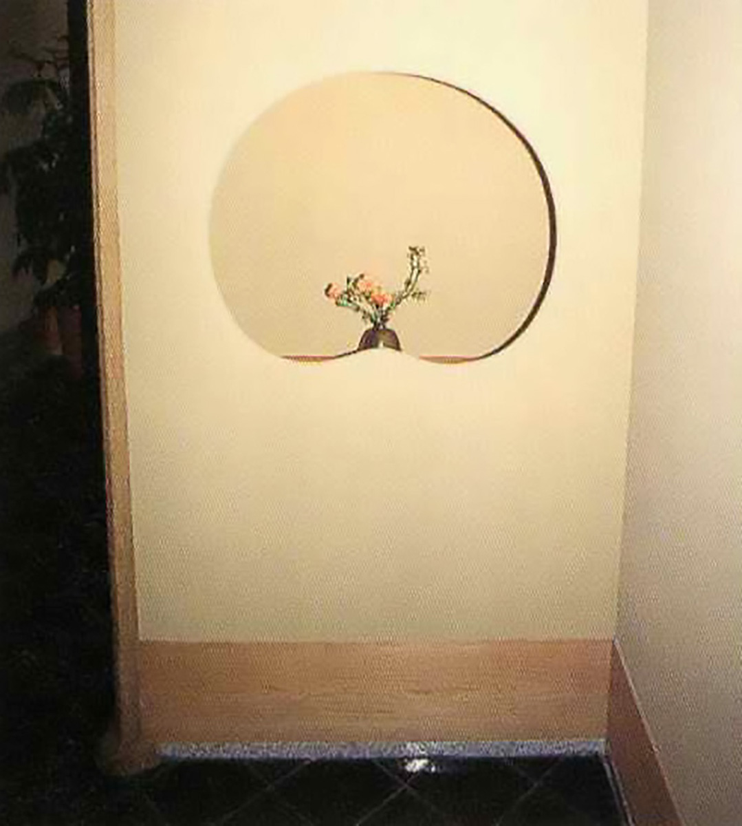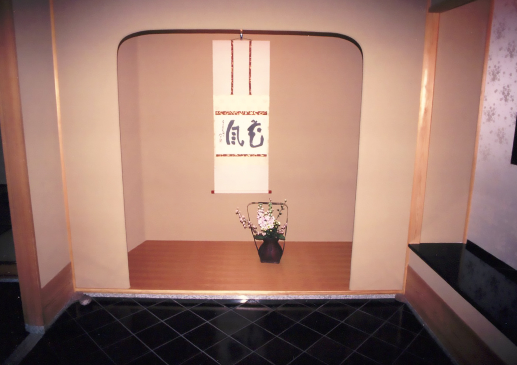 料亭の女性トイレの入口にある飾り棚の一輪差し