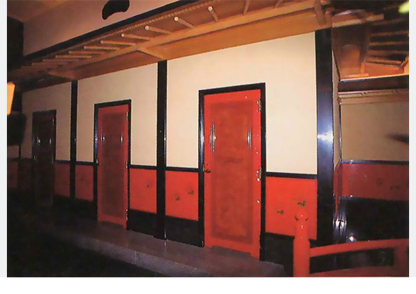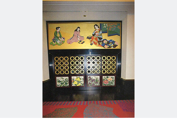 入口の大きな扉には絵画がはめこまれ、ひと目ではトイレと気づかないほど。奥には漆芸壁画のある前室が控え、独特の空間を演出しています。