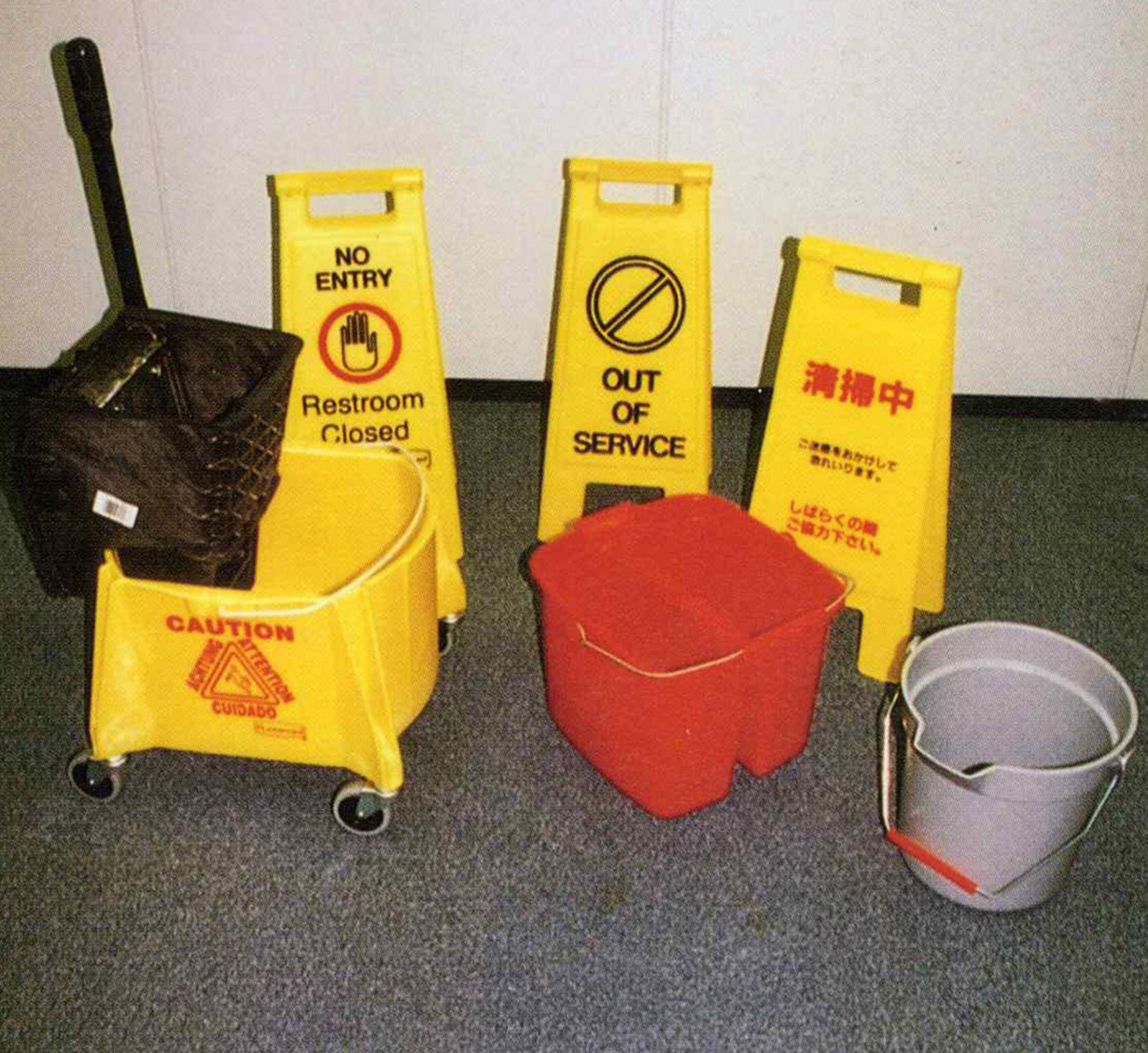 モップ用バケツや”清掃中”の看板もカラフルなデザイン(エレクター(株))